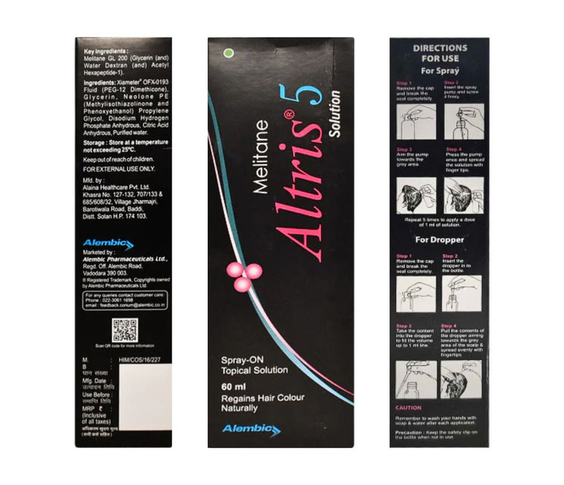 Melitane Altris 5 Solution Spray works by stimulating melanogenesis, the process responsible for melanin production in the hair follicles. By promoting melanin production, it helps restore natural hair color and prevent premature greying.