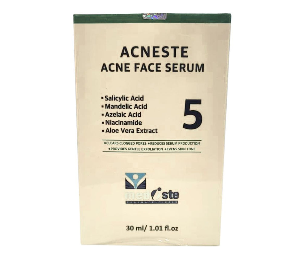 Acneste Acne Face Serum helps clear clogged pores, reduce excess oil, and gently exfoliate for a smoother, more even skin tone. Suitable for daily use on acne-prone skin, this dermatologist-recommended serum supports clearer, healthier-looking skin.
