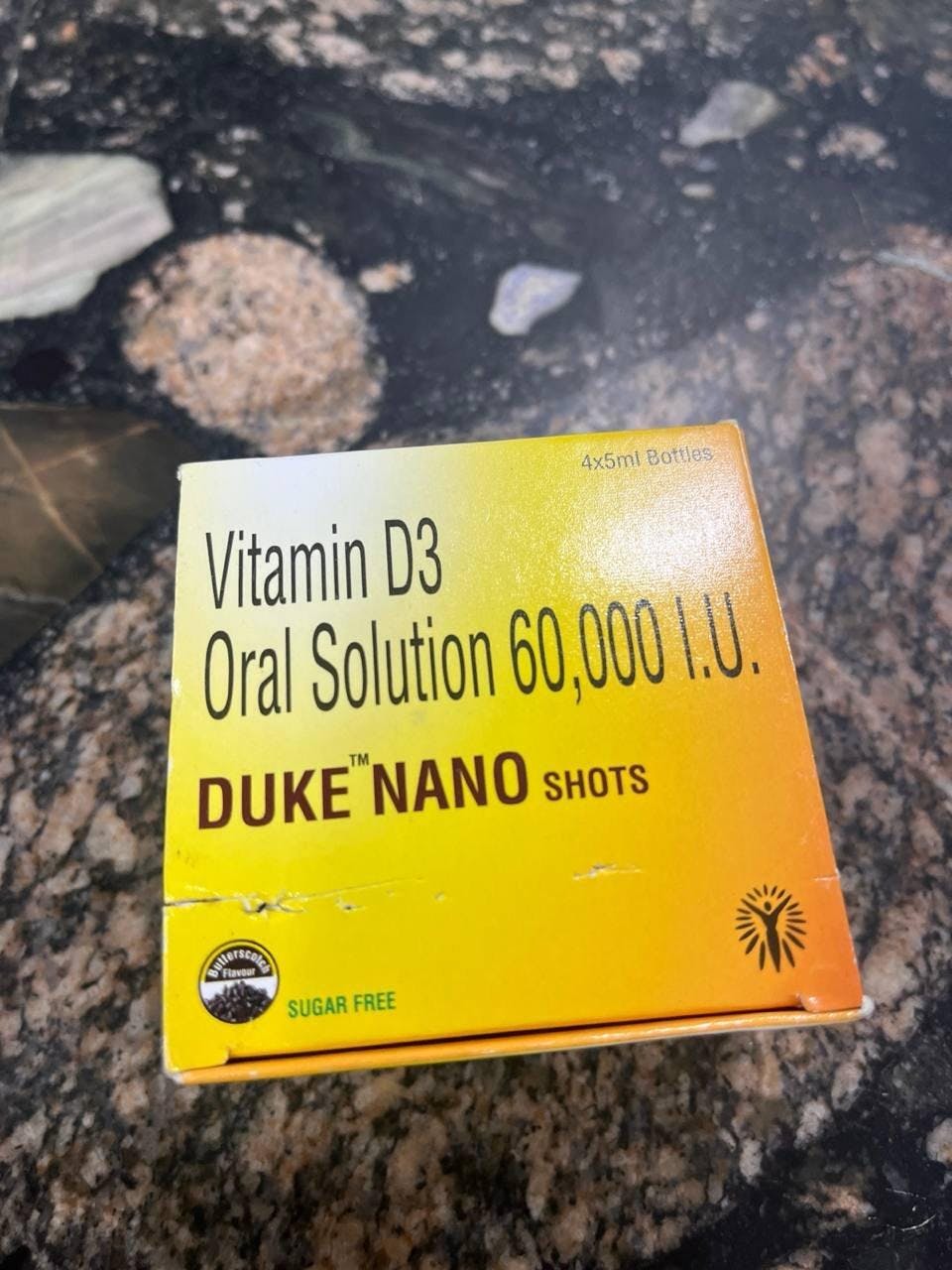Duke Nano Shots are a liquid supplement formulated to treat low blood calcium levels (hypocalcemia) and associated conditions. They contain Cholecalciferol (Vitamin D3), which helps the body absorb calcium and phosphorus, promoting proper bone health and mineralization. Duke Nano Shots are used to treat Vitamin D deficiency, osteoporosis, hypoparathyroidism, latent tetany, rickets, osteomalacia, and familial hypophosphatemia.