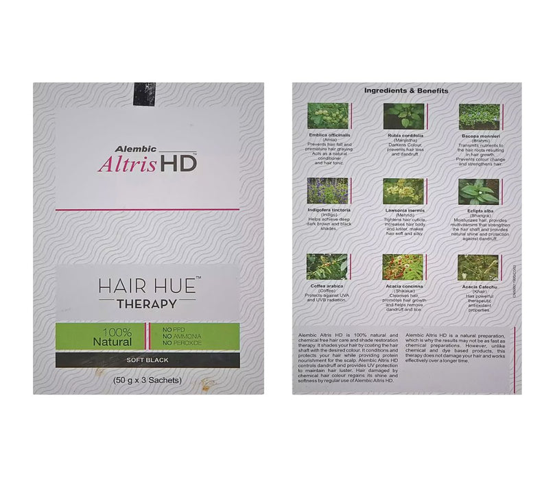 Altris HD Hair Hue Therapy Soft Black uses a protein-rich formula to replenish and enhance the hair's natural soft black shade, while also nourishing and protecting the hair and scalp.