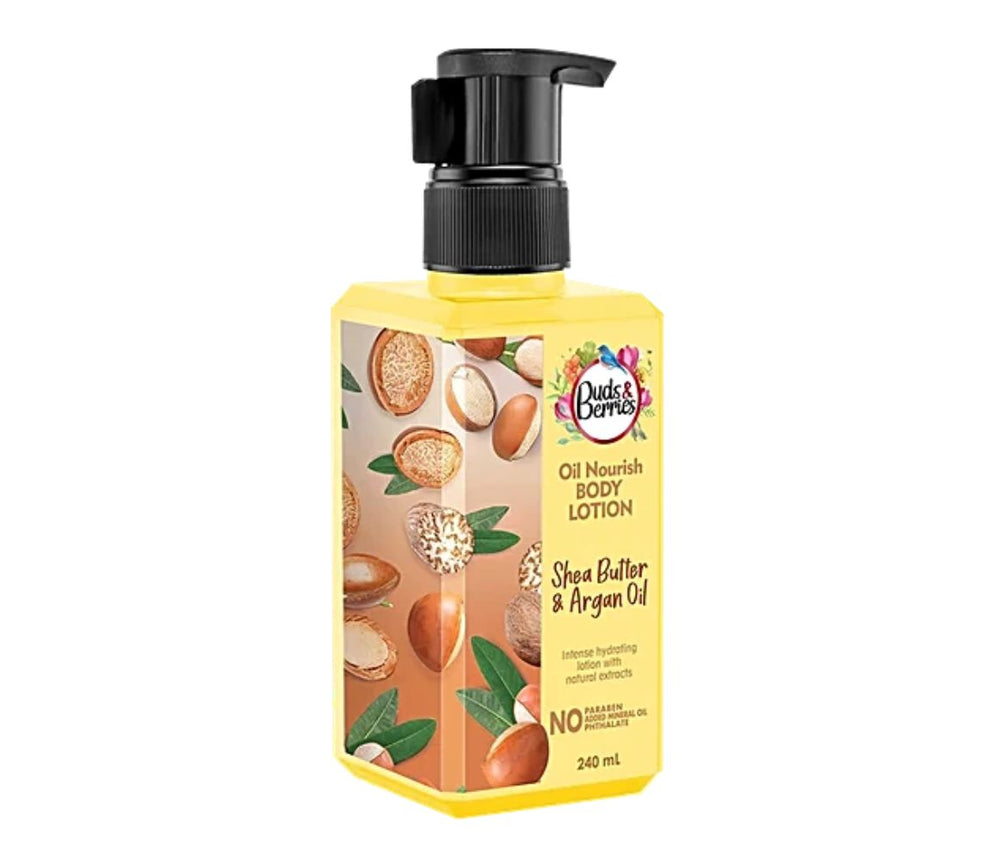 Buds & Berries Oil Nourish Body Lotion is a skincare product enriched with shea butter, argan oil, and vitamin E, designed to provide intense nourishment and hydration to the skin.