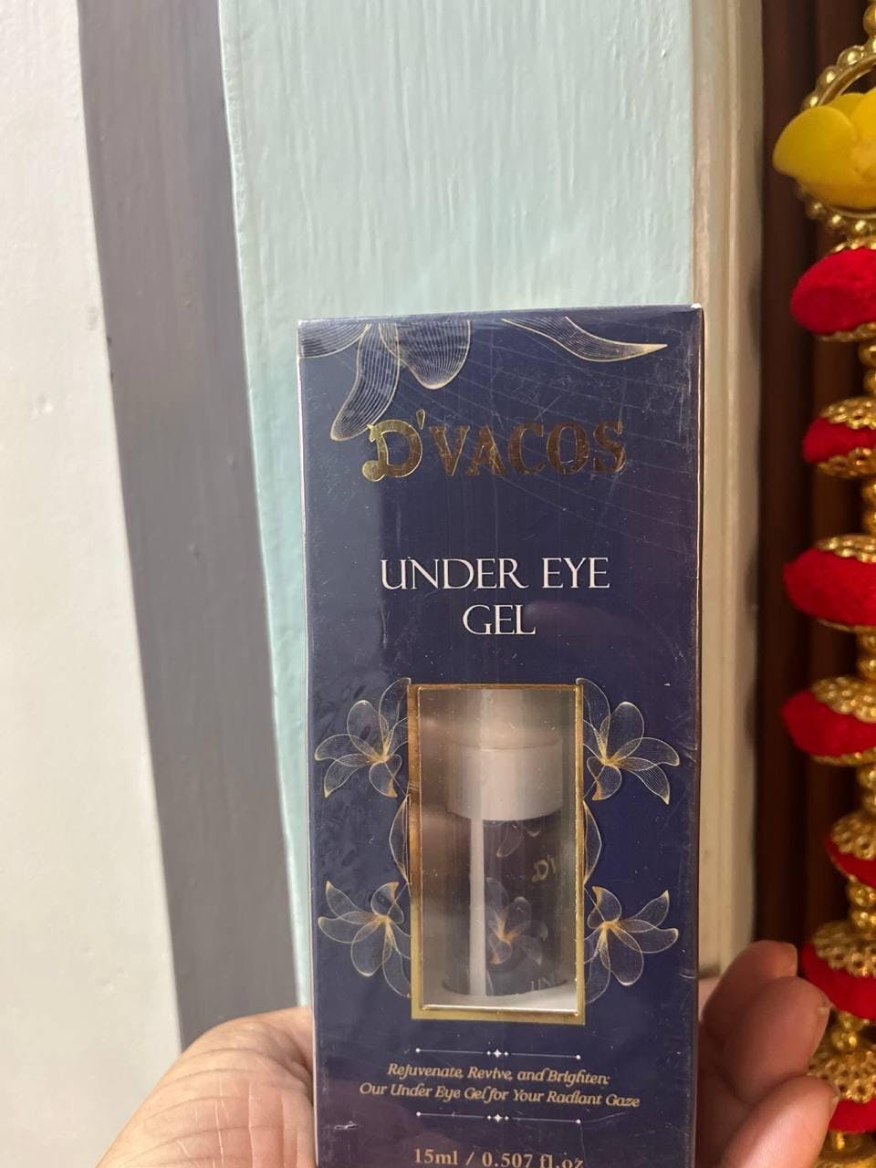 - Apply a small amount of D'Vacos Under Eye Gel to the under-eye area.