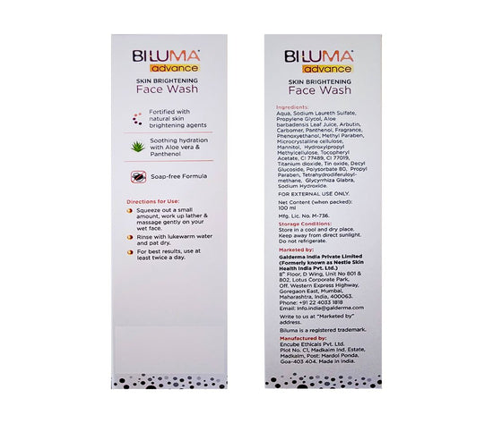The active ingredients in the Biluma Advance Skin Brightening Face Wash replenish the skin with vital nutrients, moisturize it, and work overnight to promote soft, smooth, and healthy skin.