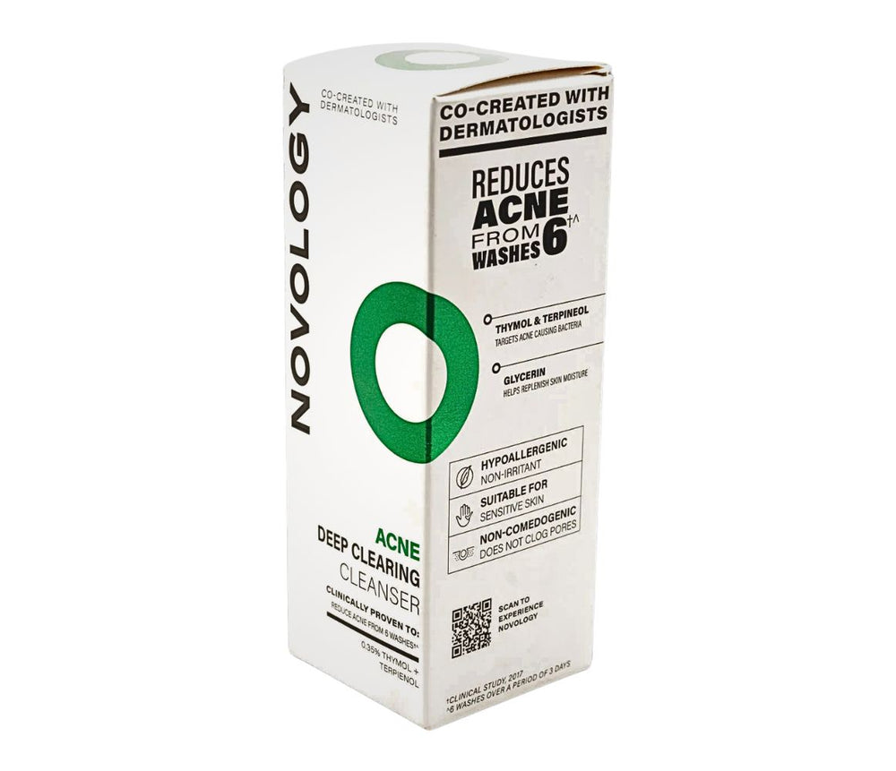 Novology Acne Deep Clearing Cleanser is formulated for those who struggle with acne, blackheads, and whiteheads. This gentle yet effective cleanser to deeply cleanse pores, remove excess oil and impurities, and help maintain your skin’s natural balance—without stripping away essential moisture. A unique blend of Thymol and Terpineol, two powerful ingredients that work together to target and help reduce acne-causing bacteria while being gentle enough for everyday use. The formula is non-comedogenic and hypoallergenic, making it suitable for sensitive, oily, and combination skin types. With regular use, expect a fresher, smoother complexion and fewer breakouts.